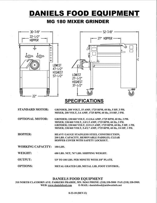 View full detailsDaniels MG 180 Commercial Meat Mixer Grinder, 5 HP, 208V, 3 Phase