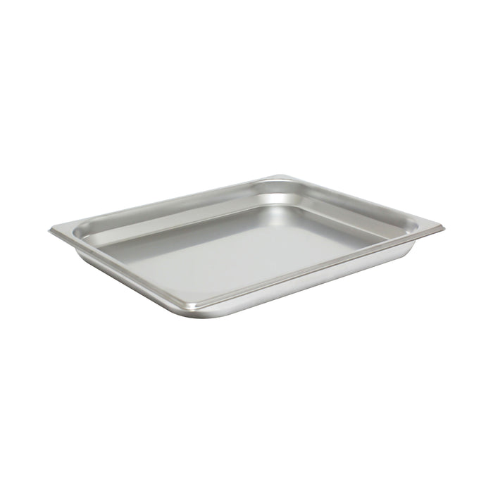 The Thunder Group STPA3121 steam table pan is designed for safe use in an oven, steam table, and dishwasher. It's durable 18/8 stainless steel construction is made to withstand frequent use, while its 24-gauge width is lightweight for simple transportation from kitchen to buffet. The pan can hold oven-baked casseroles or oven-roasted vegetables and be directly transferred to a steam table to keep warm. Once it needs to be removed, users can quickly do so because of its anti-jam rim. At half-size, it measures 102/5 inches long by 124/5 inches wide by 11/4 inches deep.
